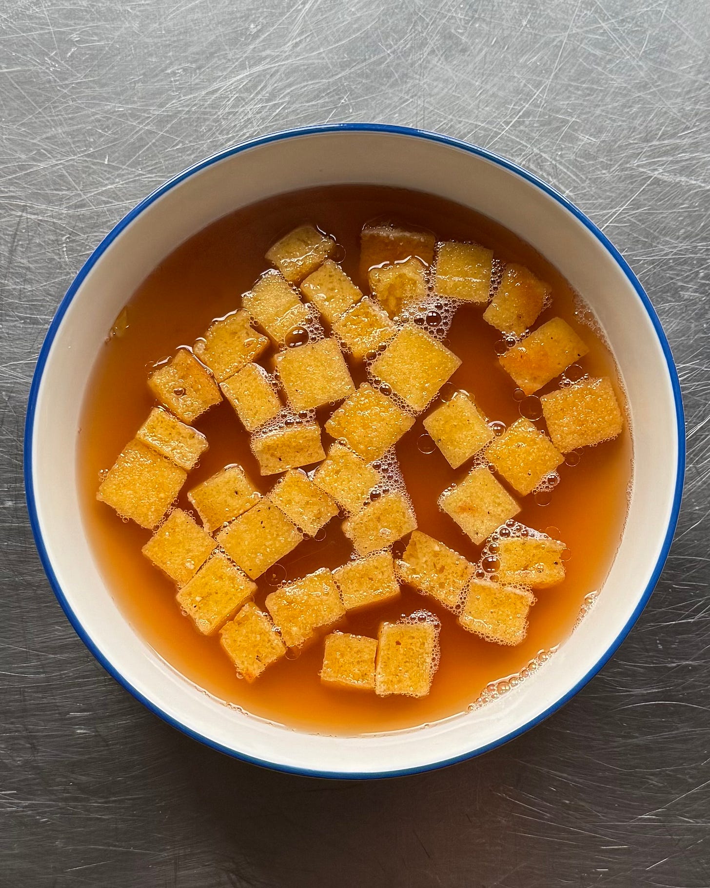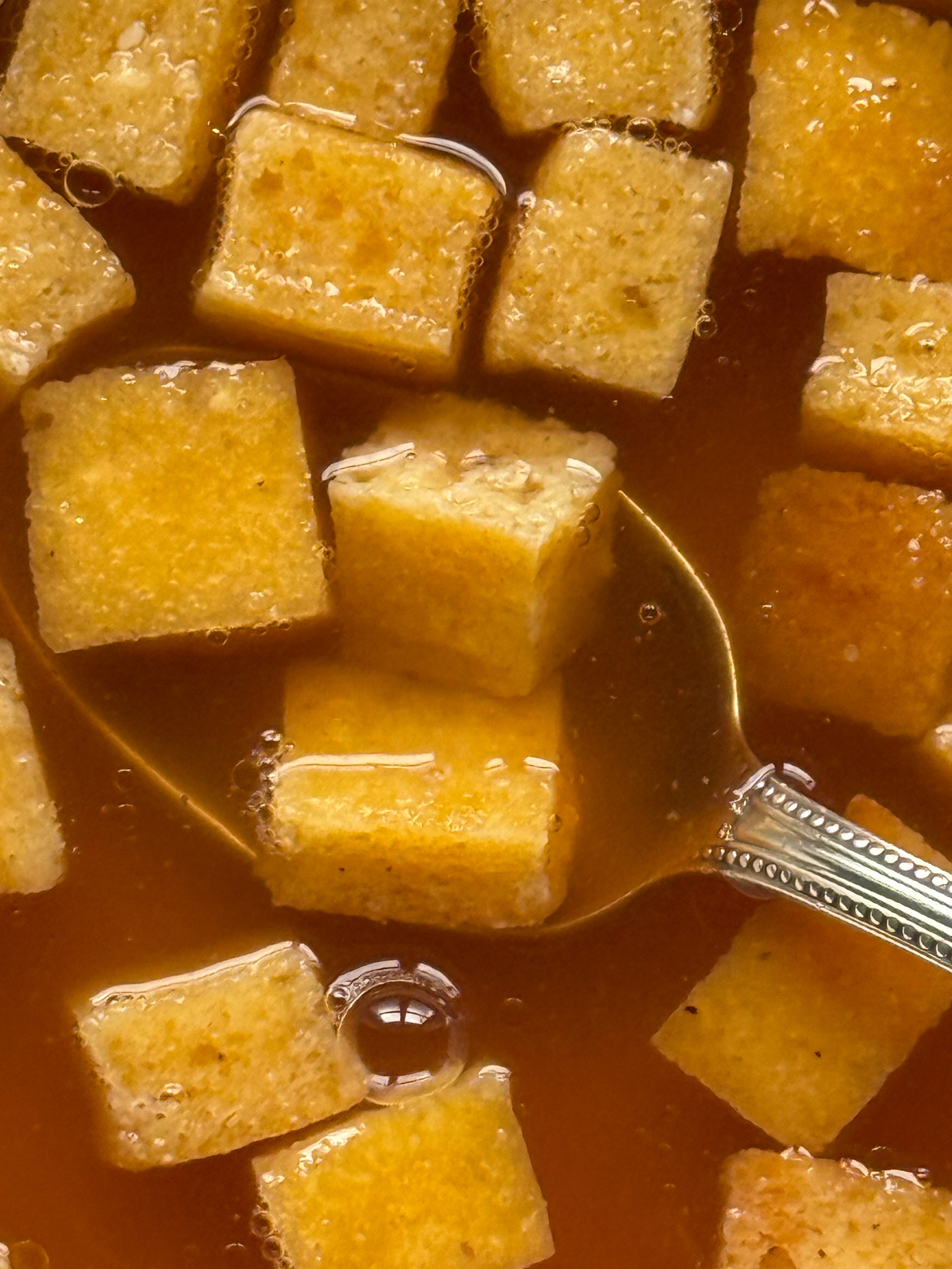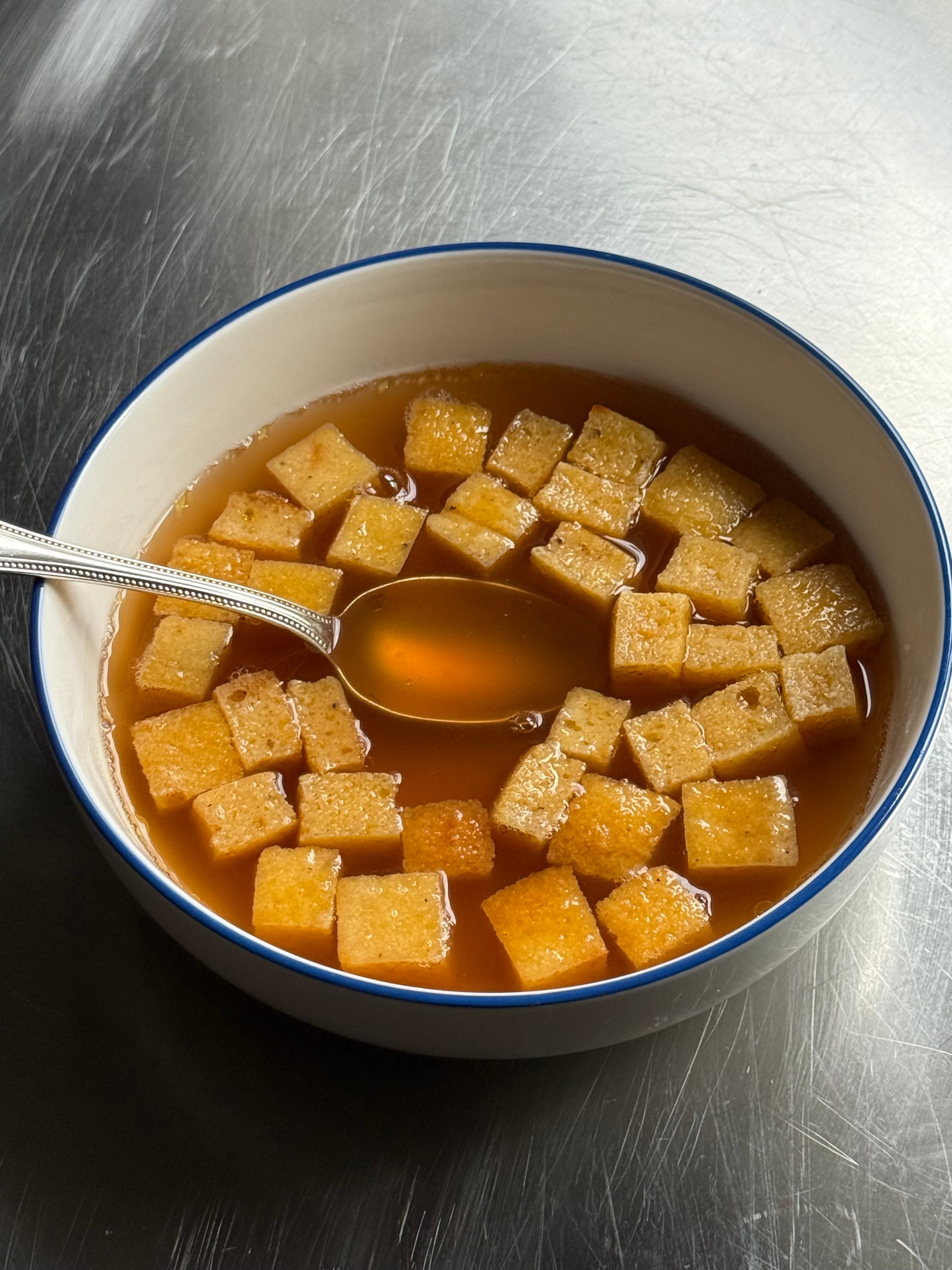 Optional: place the cubes back into the oven on a lower temp to crisp them up a bit, then serve them drenched in hot broth and enjoy!