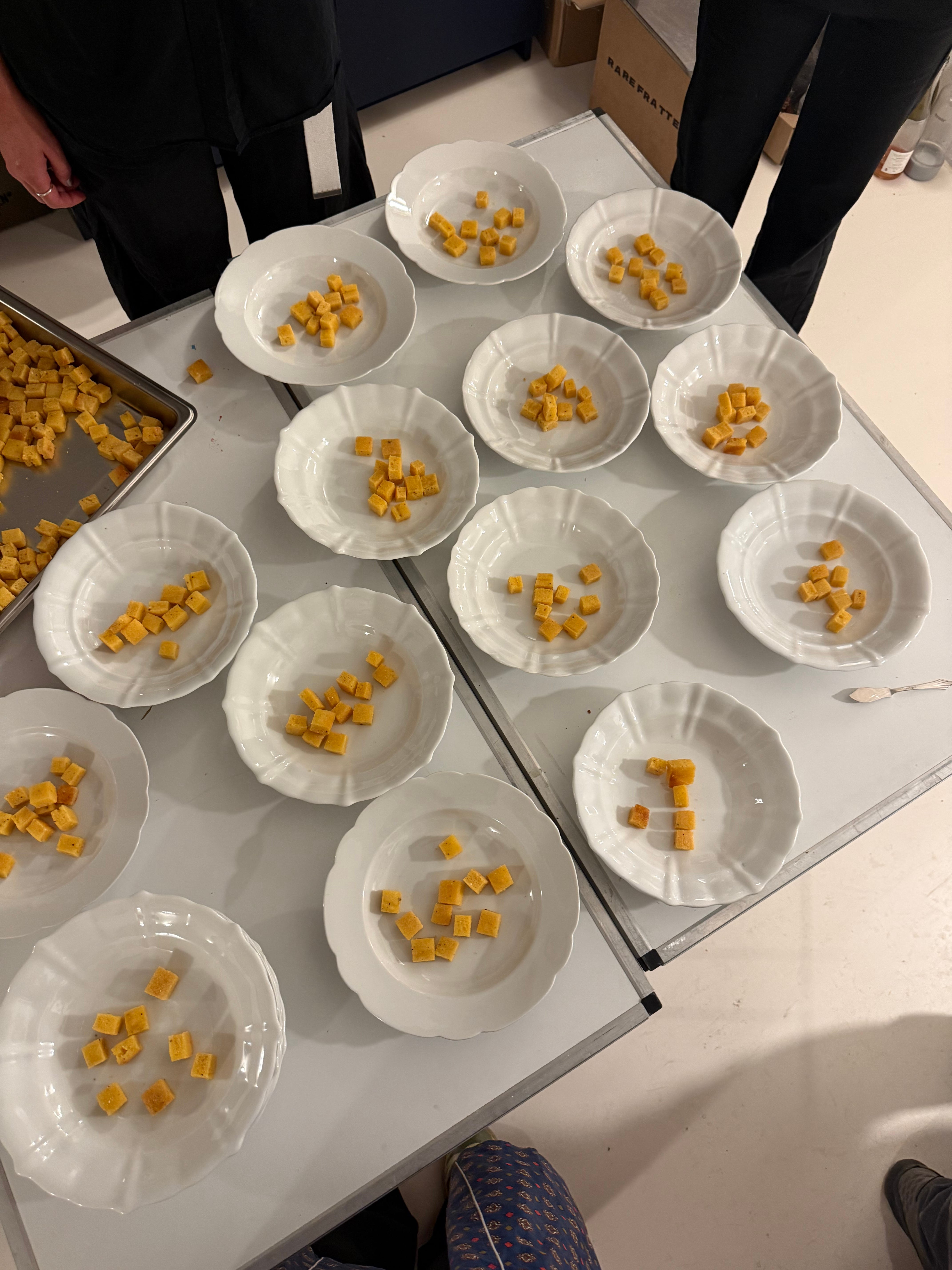 This soup is great for a crowd! All components can be made in advance and heated up and merged just before serving. See below, I served it for a 22 person seated dinner (more on that below). We placed the cubes in the bowls first, then poured the broth at the table to avoid excessive splishing and splashing.