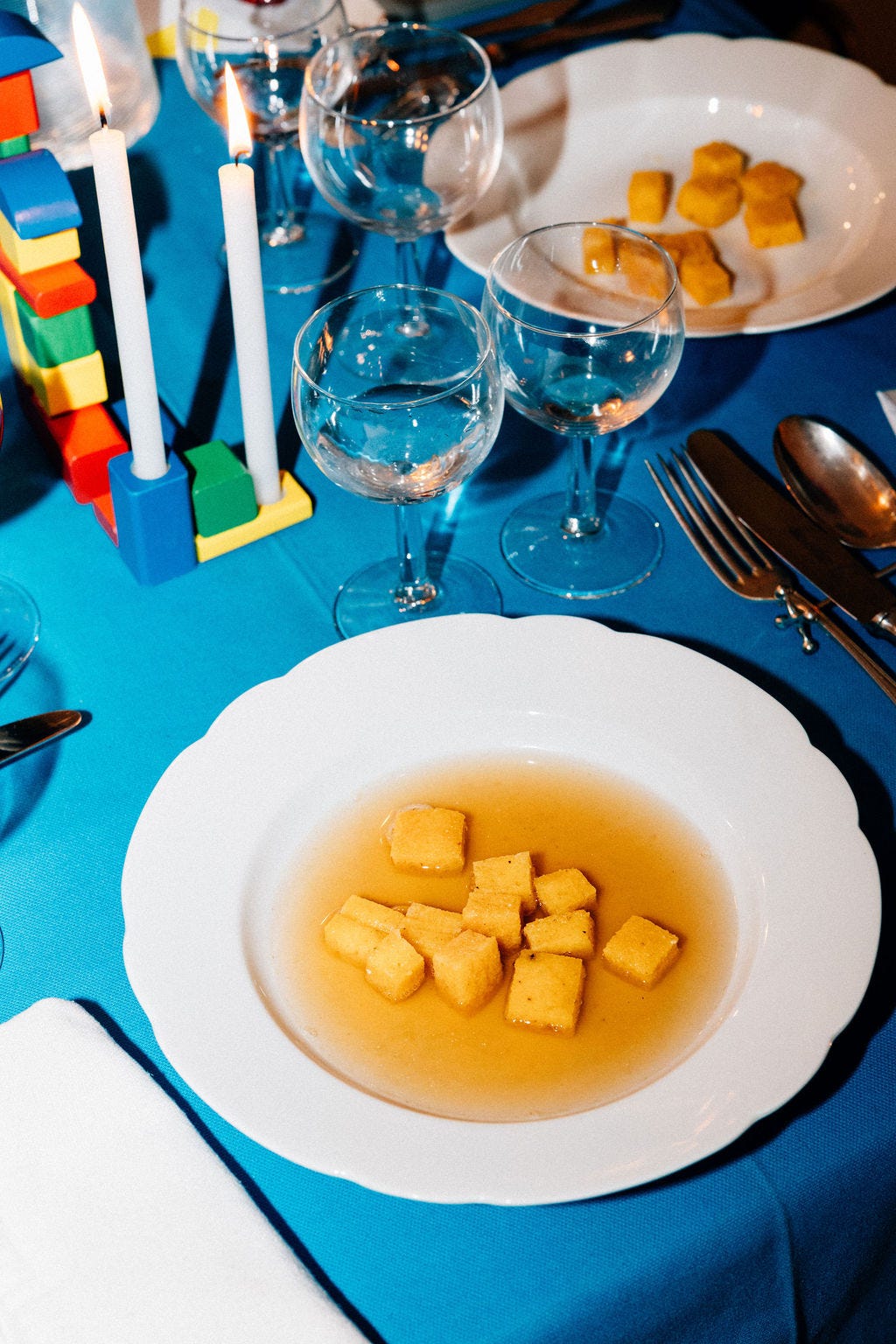 I decided to make it even more cheesy and flavourful by serving the cubes drenched in parmesan-porcini broth (rather than the typical meat stock) - a scrappy and might I say delicious alternative.